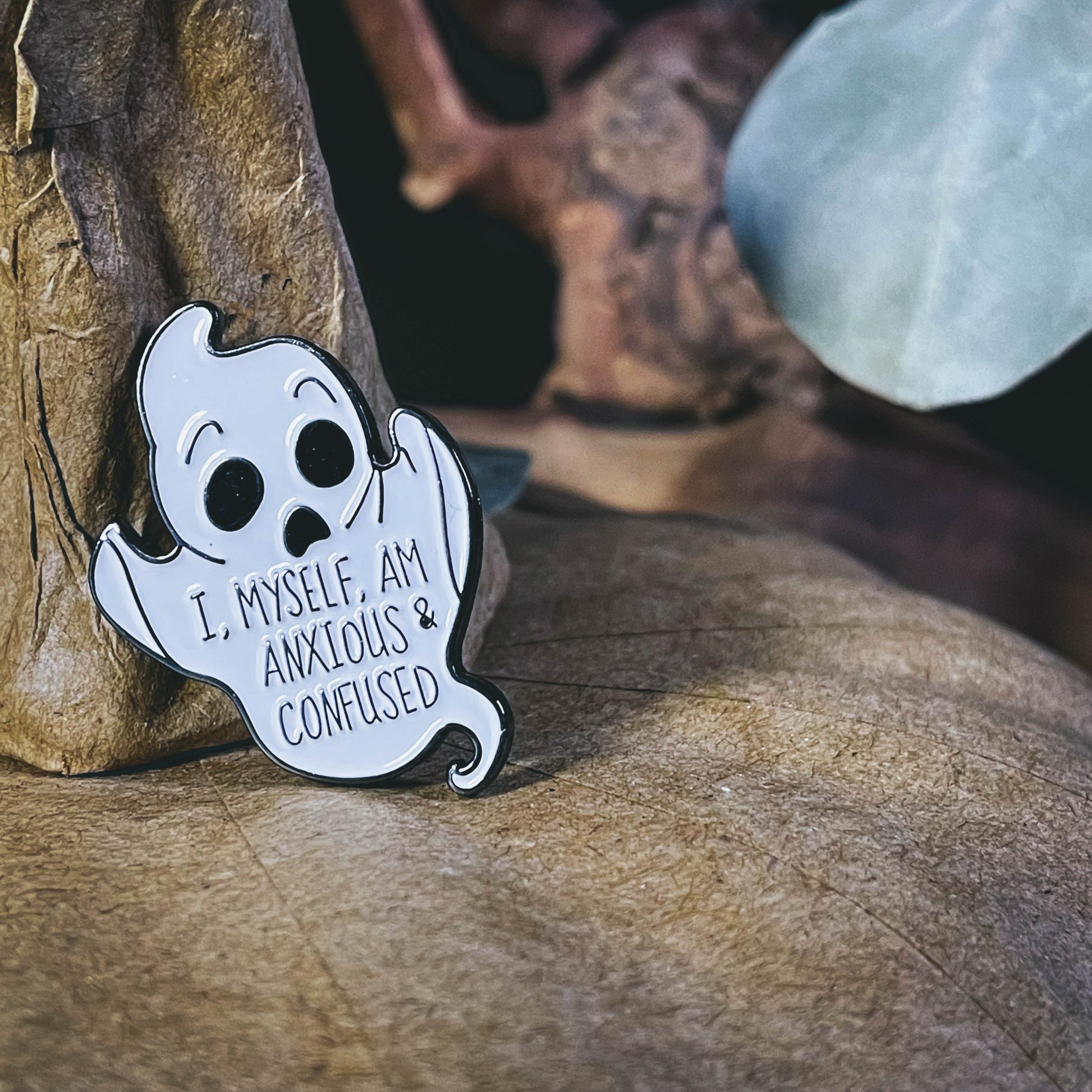This gothic delight is perfect for those who feel like they're in a haunted state of mind. The Anxious & Confused Ghost Enamel Pin shows off your rockin' horror vibes in style! It features a ghost in a confused and anxious state, rendered on a high-quality enamel pin, sure to spook and delight. So, if you're looking to add some spooky flair to your style, this pin has your back!