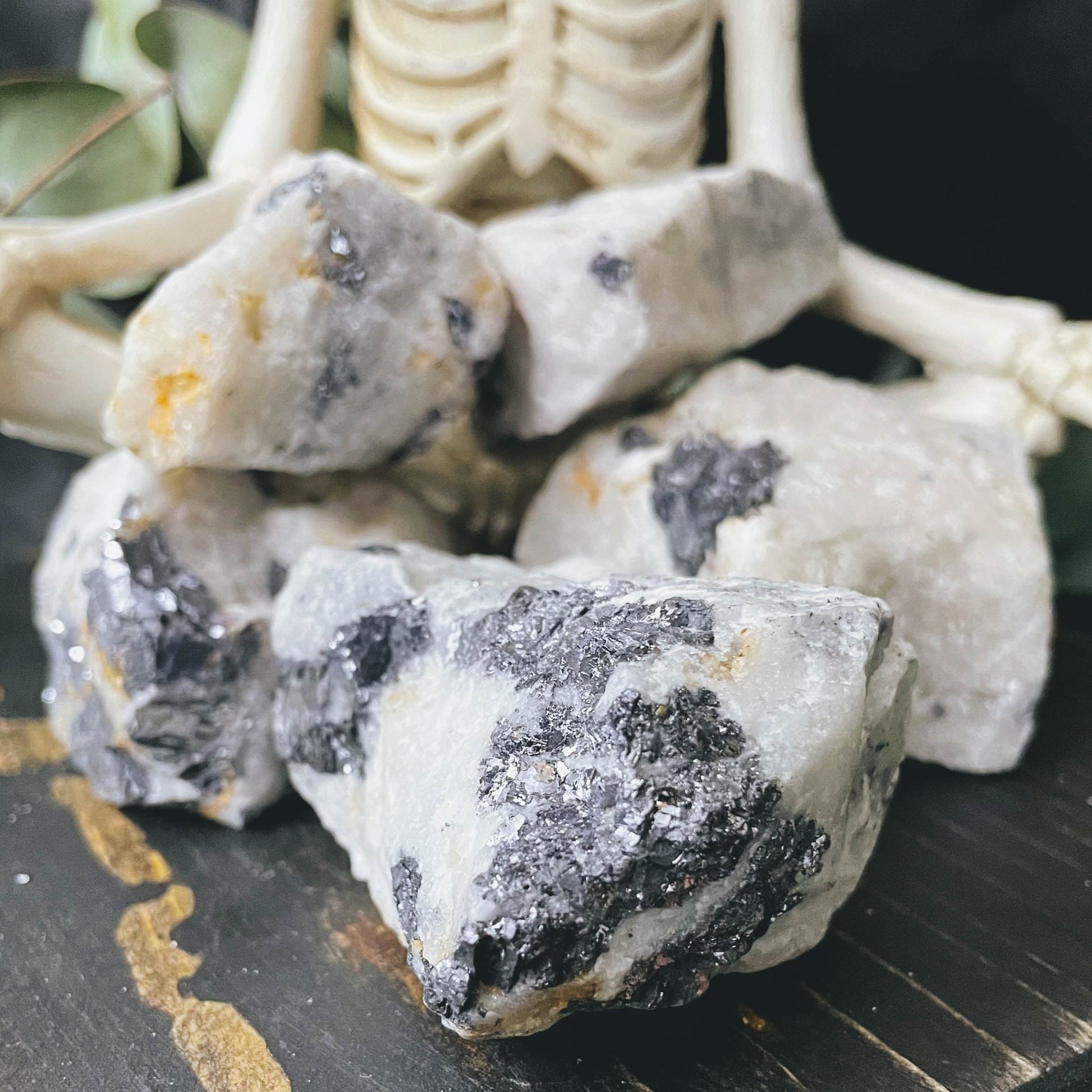 2-3" Galena with quartz from Morocco. Galena is the silver, Quartz is the white. Galena‘s heavy weight gives it a powerful grounding ability and is associated with the root chakra. Quartz gives us the gift of amplifying & manifestation. These are rough stones and as such the coloration and size may vary slightly. We will make sure to give you a nice mix!