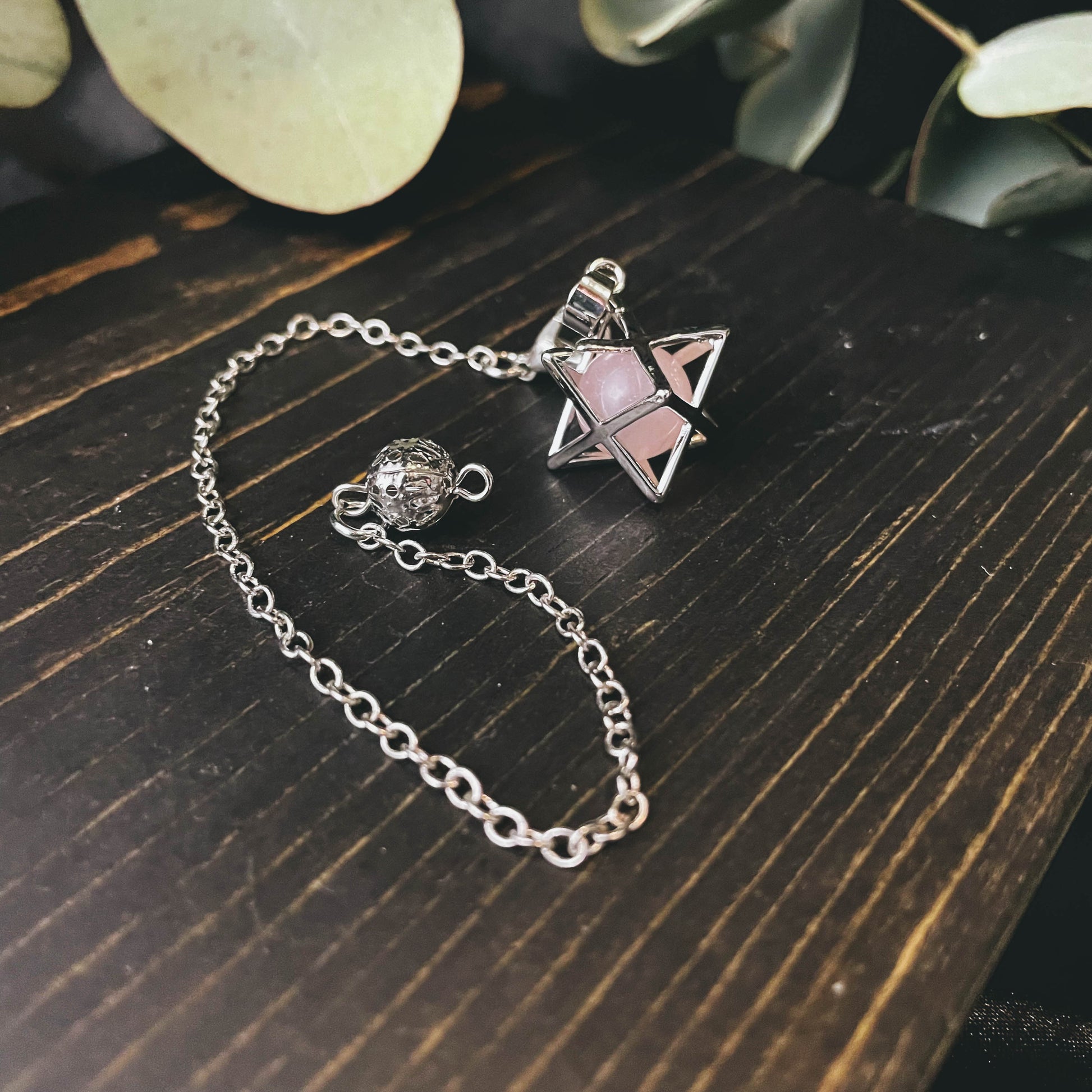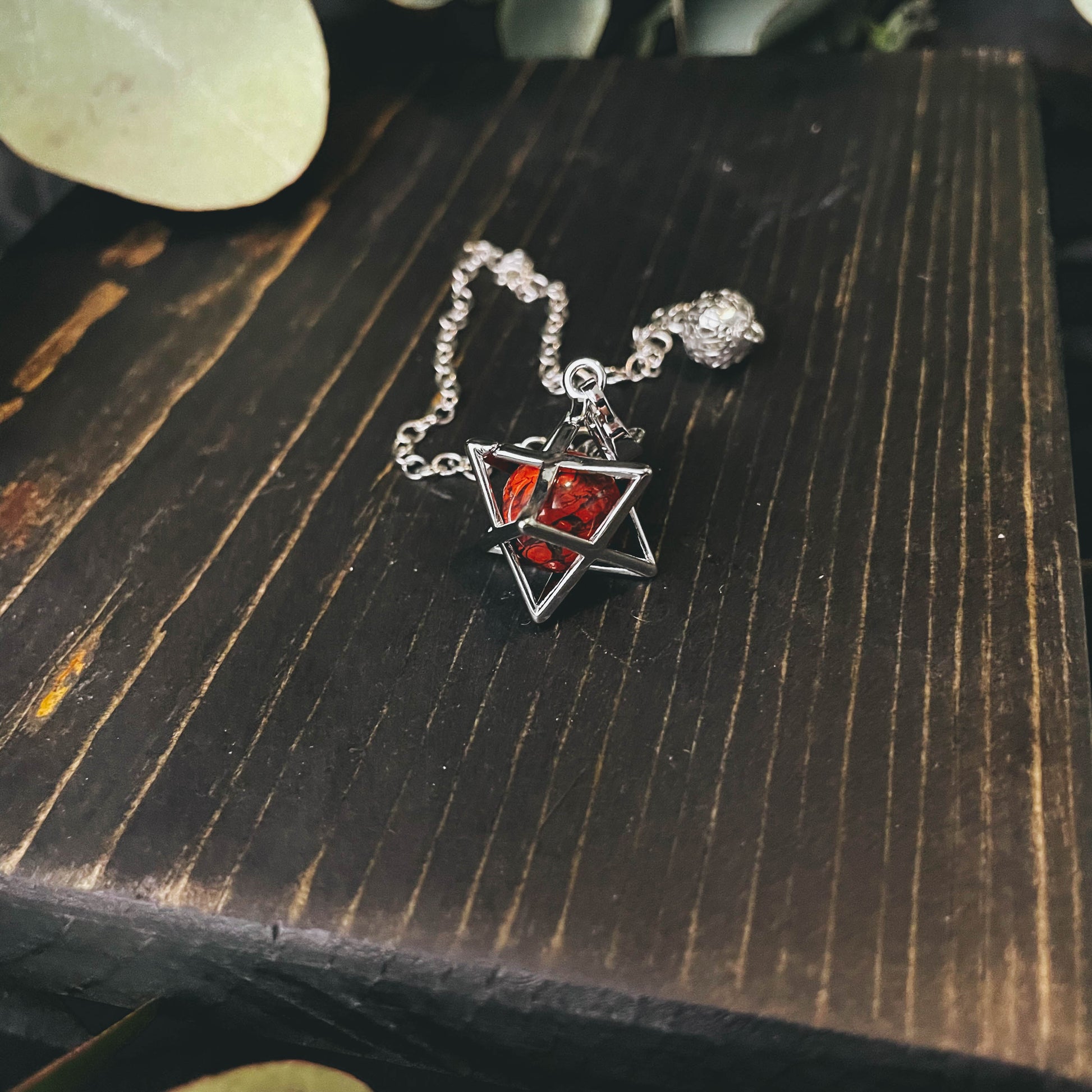 The unique hollow shape of this pendulum would be a great addition to a collection old or new. The pendant is about 2.3 x 2 x 2cm and the chain length is about 18cm