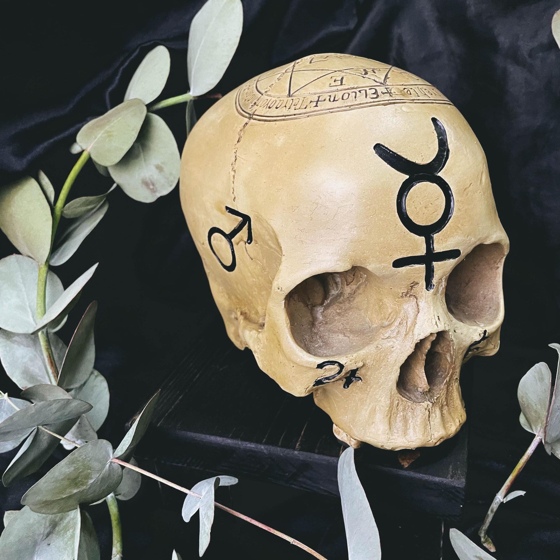 This occult skull is well detailed and sure to make all the occult and spooky lovers instantly jealous. The skull has various sigils carved into the surface with one larger one on top.