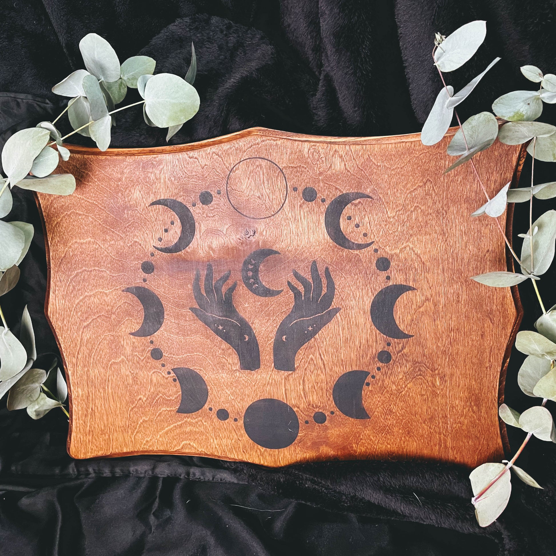 This handmade wooden altar is made of maple plywood and stained. The design has been burned into the wood. This technique makes the image permanent and it will never fade, chip or peel. The altar is approximately 15.5 x 11.5 inches and 1/2 inch thick and it lays flat, with no legs. The back and sides are also stained and sealed, so no raw wood is exposed. This altar comes in two designs.