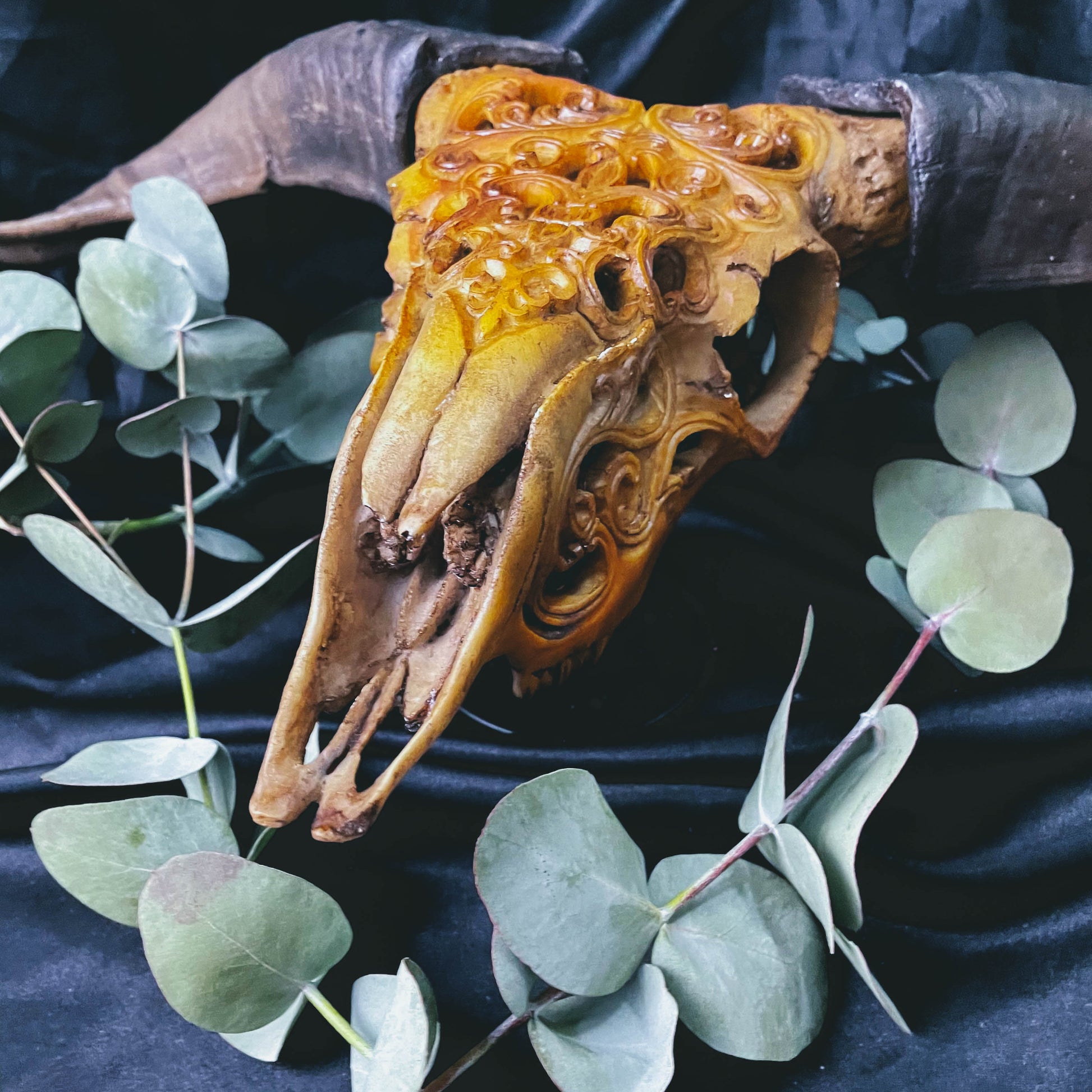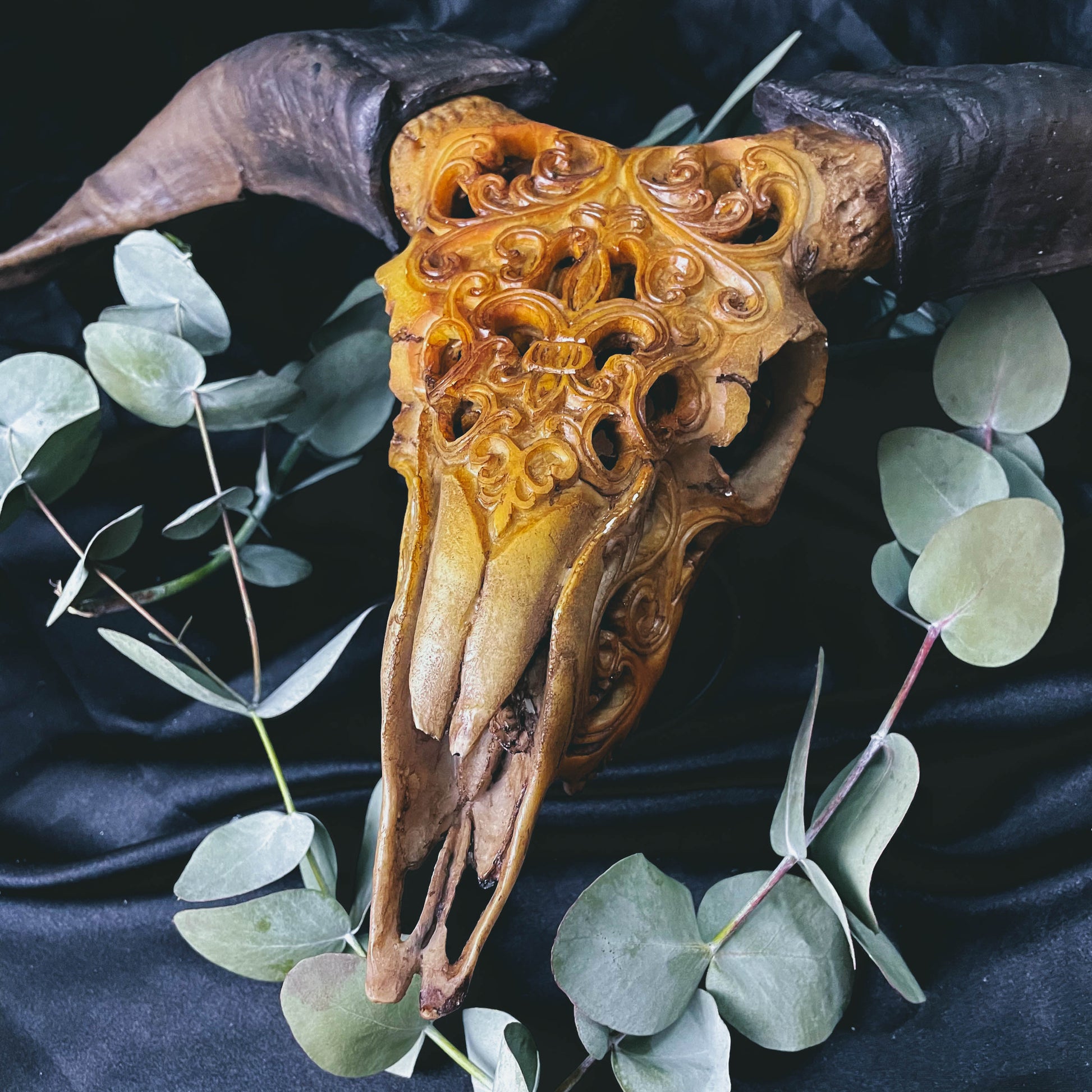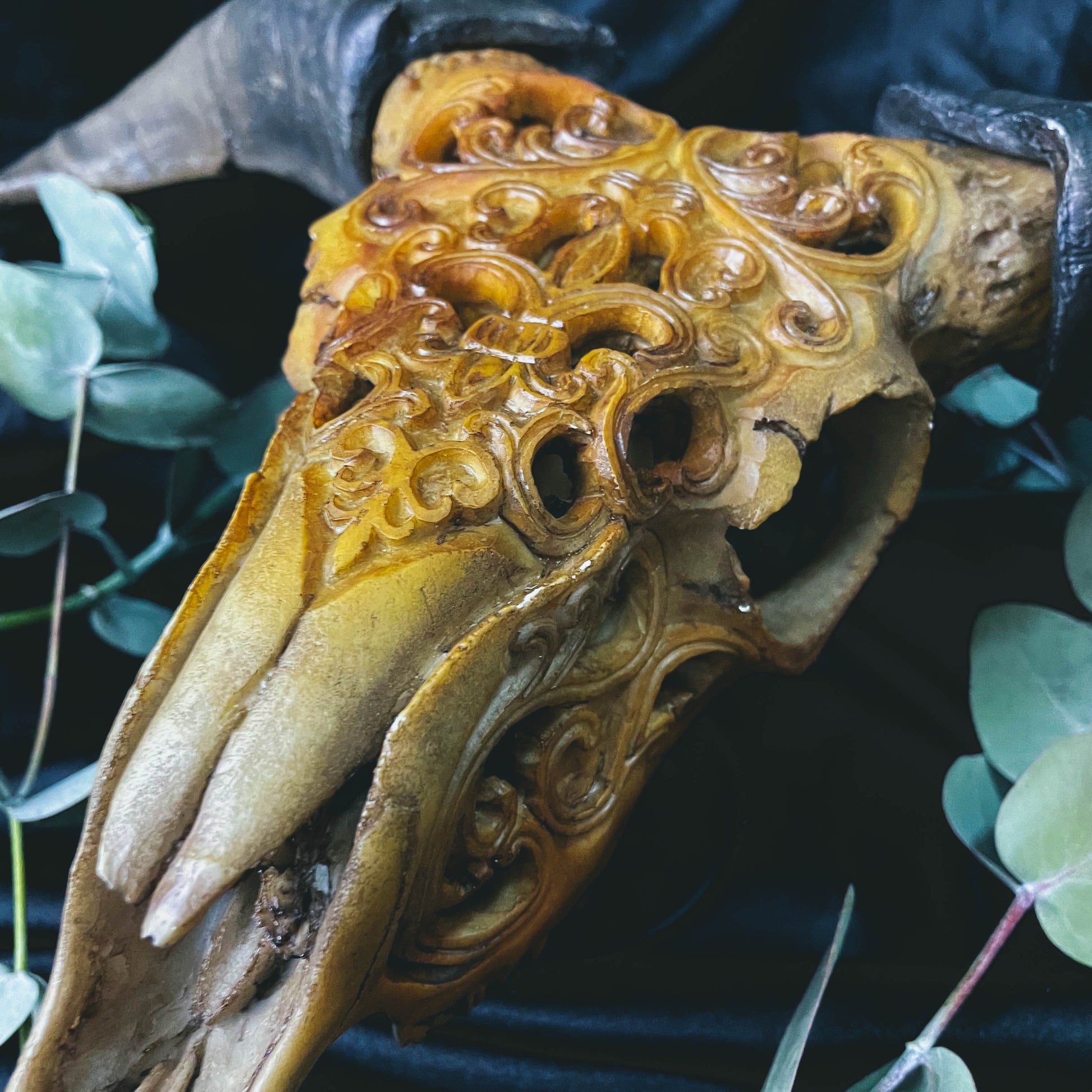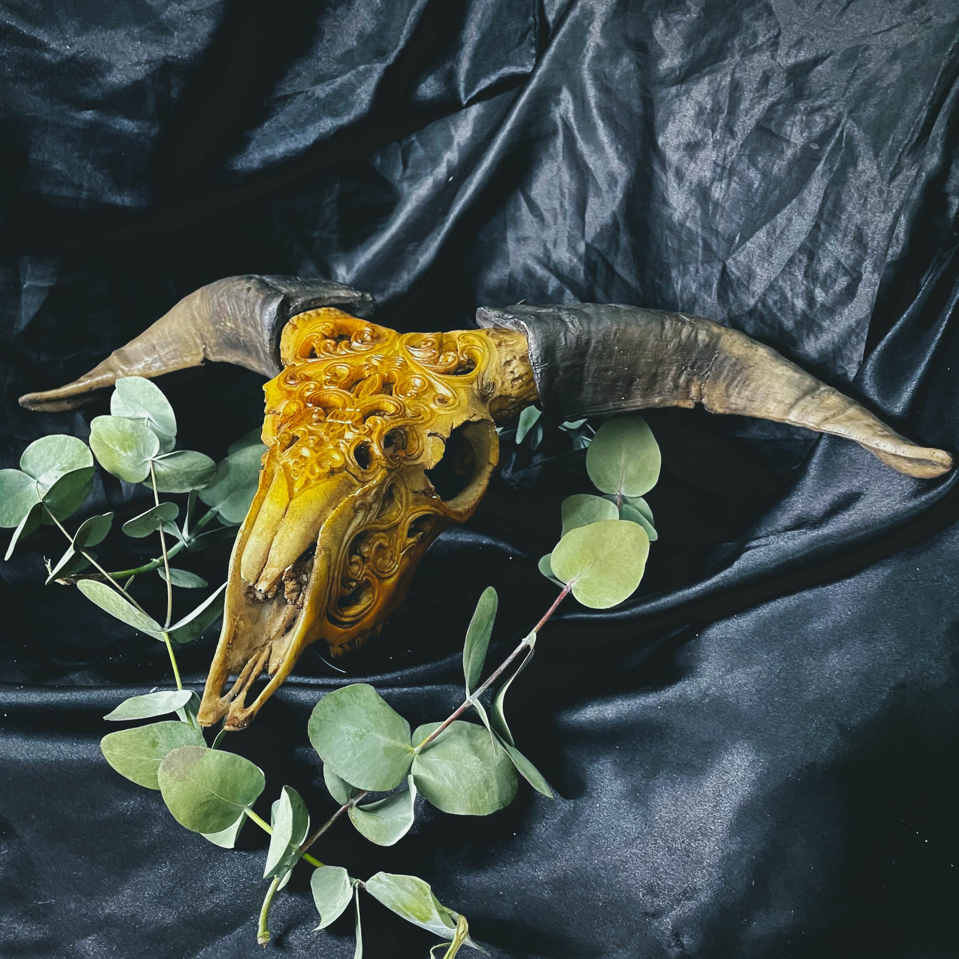 This unique etched skull wall decor is a great for either mounting to the wall or standing on a shelf as display! It is cast from resin and measures 10" x 7" x 18.5".